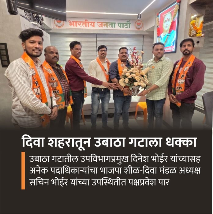 दिवा शहर हा शिवसेनेचा बालेकिल्ला ओळखला जातो.मात्र देशात आणि राज्यात भाजपा मोठ्या संख्येने जिंकत असल्याने या बालेकिल्ल्यालाही भाजपचे आवाहन दिसून येत आहे.राज्यात महायुती असली तरी आता महापालिकांच्या निवडणुकांत अनेक कार्यकर्ते एकाच पक्षात नाराज असल्याचे दिसून येत आहेत.त्या त्या पक्षात त्यांना मिळत नसलेला सन्मान यामुळे उबाठा गटातील उपविभागप्रमुख दिनेश यशवंत भोईर ,मनिष घाग,हरिश्चंद्र पालकर,रवी ठाकूर,चेतन सुतार,संतोष पडियार आदी महत्वाच्या कार्यकर्त्यांनी दिव्यातून कमळ हाती घेतल्याचे दिसून येत आहेत.