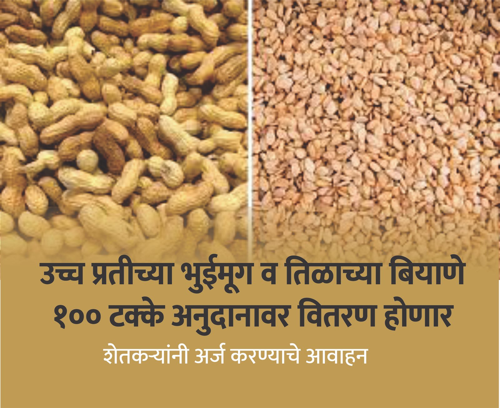 उच्च प्रतीच्या बियाण्यांचा साठा जिल्ह्यांत उपलब्ध असून, अभियानांतर्गत रब्बी हंगाम 2025 साठी भुईमूग पिकासाठी हेक्टरी 150 किलो (रक्कम रु.114 प्रती किलो) शेंगा व तीळासाठी हेक्टरी 2.5 किलो (रक्कम रुपये 197 प्रती किलो) प्रमाणित बियाणे केंद्र शासनाने विडकेलेल्या जिल्ह्यांना 100 टक्के अनुदानावर वितरीत करण्यात येणार आहेत. यामध्ये भुईमूग पिकाचे 100 टक्के अनुदानावर प्रमाणित बियाण्यांचा लाभ नाशिक, धुळे, अहिल्यानगर, पुणे सातारा, सांगली, कोल्हापूर, छत्रपती संभजीनगर व अकोला या 9 जिल्ह्यातील शेतकऱ्यांना द्यावयाचा आहे. तसेच तीळ पिकाचे 100 टक्के अनुदानावर प्रमाणित बियाण्यांचा लाभ जळगाव, बीड, लातूर व बुलढाणा या 4 जिल्हयातील शेतकऱ्यांना द्यावयाचा आहे