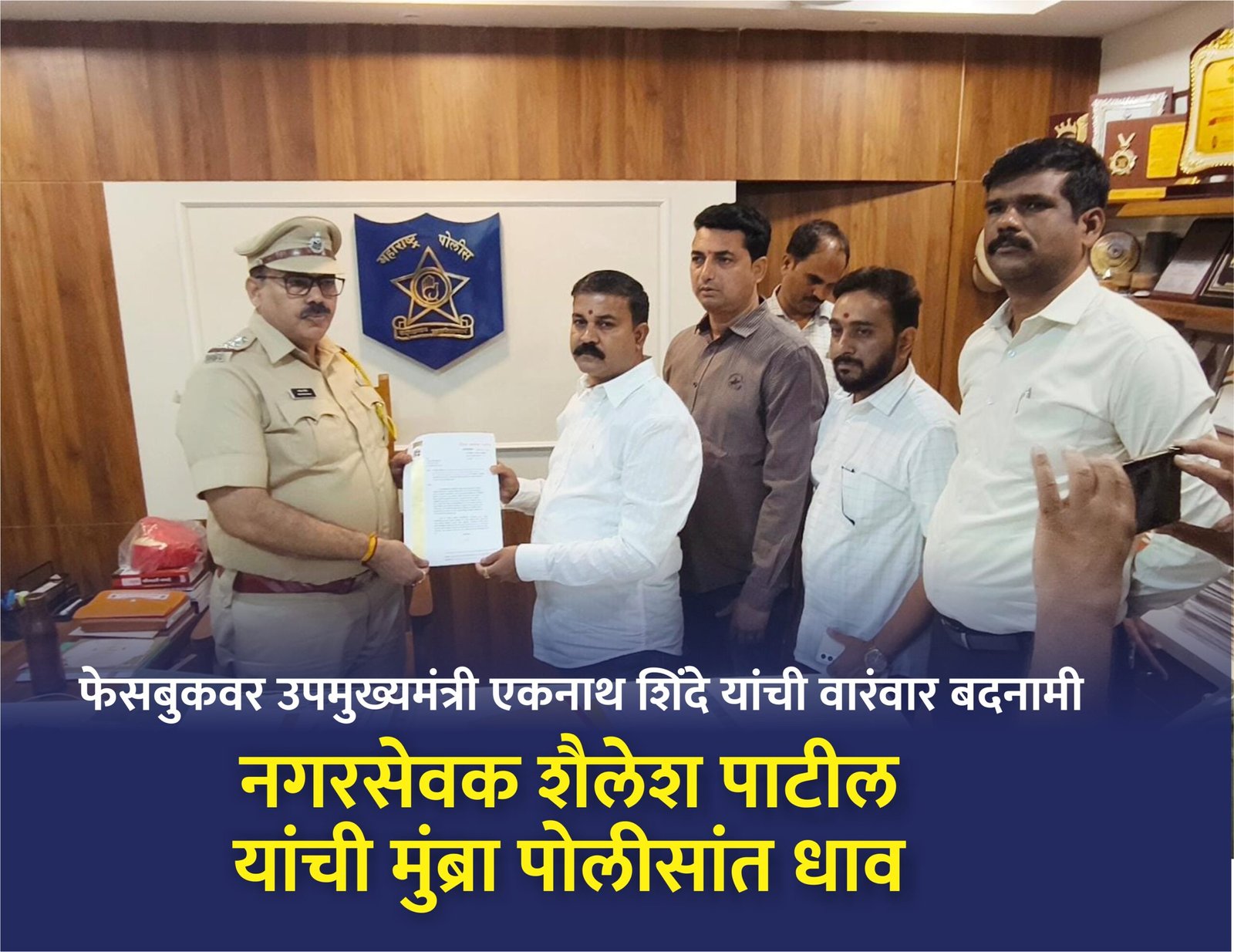 श्री शैलेश मनोहर पाटील हे दिवा शहरातील तीन टर्म मोठ्या मताधिक्याने निवडणुन आलेले ठाणे महानगरपालिकचे विद्यमान नगरसेवक आहेत.त्यांनी आज आपल्या वरिष्ठ नेत्यांवर सोशल मिडीयावरील वारंवार होणारी बदनामी सहन न झाल्याने मुंब्रा पोलीस स्थानकात तक्रार दाखल केली आहे.तक्रारीत त्यांनी म्हटले आहे की,गणेश निळकंठ पाटील हे वारंवार फेसबुकच्या माध्यमातून राज्याचे उपमुख्यमंत्री एकनाथ शिंदे यांच्यावर विविध प्रकारे आरोप करीत कार्यकर्त्यांच्या भावाना दुखावतील असे लिखाण करीत आहेत. श्री एकनाथ शिंदे हे मुक्ता बिल्डरला हाताशी धरुन येथील कांदळवन बुजवण्यास सांगून बिल्डींगचे काम करण्यास सांगत आहेत.खाडी बुजवून मुक्ता बिल्डरला बांधकामासाठी जागा उपलब्ध करुन देत आहेत.गाववाल्यांच्या जमीनी बळकावित आहेत.कांदळवन आणि खाडी बुजविण्याचे काम करीत आहेत.
