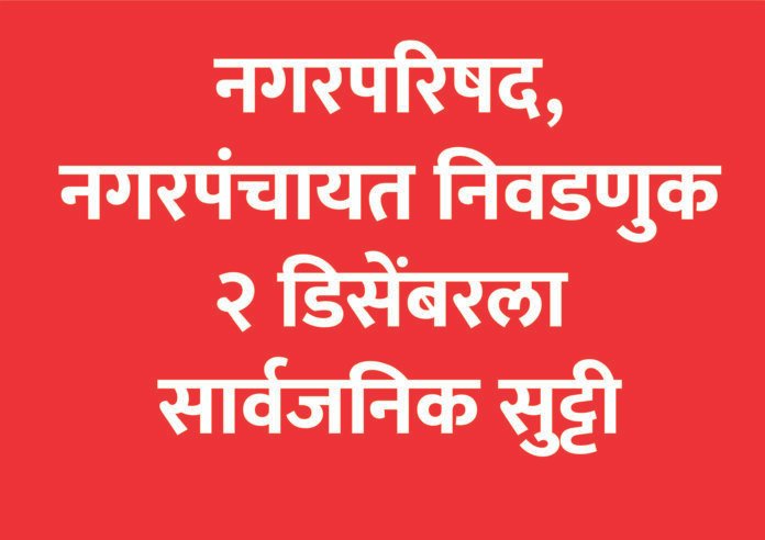 मुंबई :- नगरपरिषदा आणि नगरपंचायतीच्या सार्वत्रिक निवडणुकांसाठी २ डिसेंबर २०२५ रोजी मतदान होत असून, मतदानासाठी संबंधित स्थानिक स्वराज्य संस्थेच्या मतदारसंघात सार्वजनिक सुट्टी जाहीर करण्यात आली आहे.